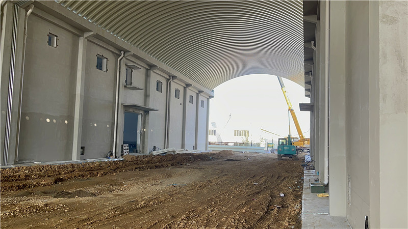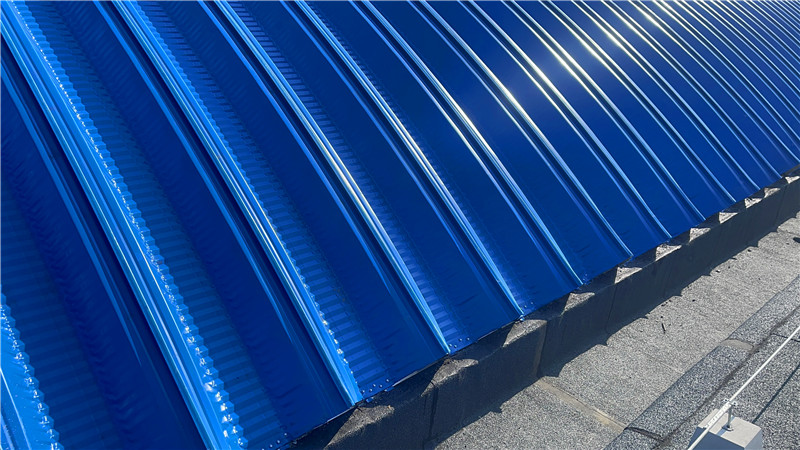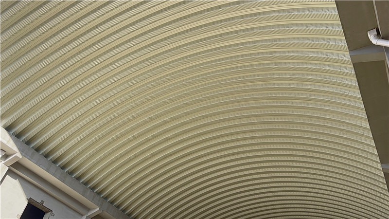 本次拱形波纹钢屋面采用914-610型结构,拱跨18.10米,长度85.82米,总覆盖面积超1500㎡。屋面选用冠洲品牌彩涂卷,厚度1.0mm,正面海蓝色、背面灰白色,兼顾耐腐蚀性与视觉协调性。