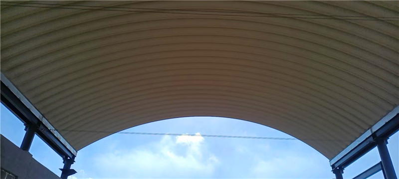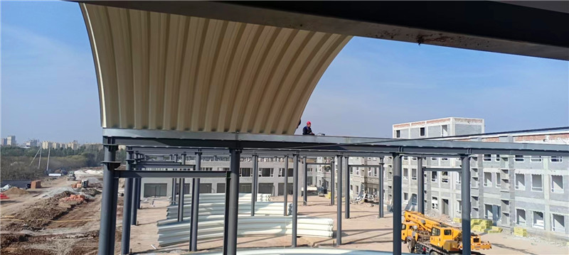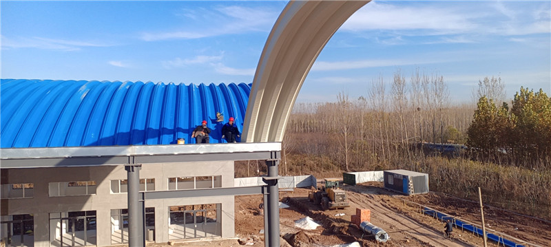 屋顶采用的板材为TS280GD-Z高强度镀锌钢板,厚度1.0mm,宽度914mm,具备良好的抗腐蚀性与强度。结构设计按照矢跨比0.2进行合理拱形设计,有效提高了屋面的排水能力和抗风能力。